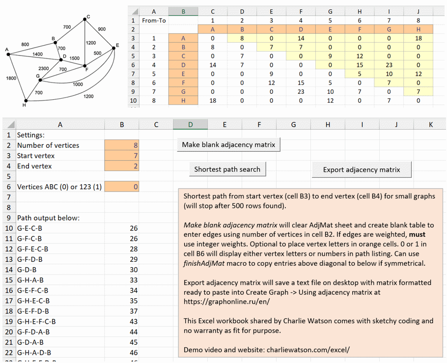 Find the shortest path between vertices in graph from its distance/adjacency matrix.